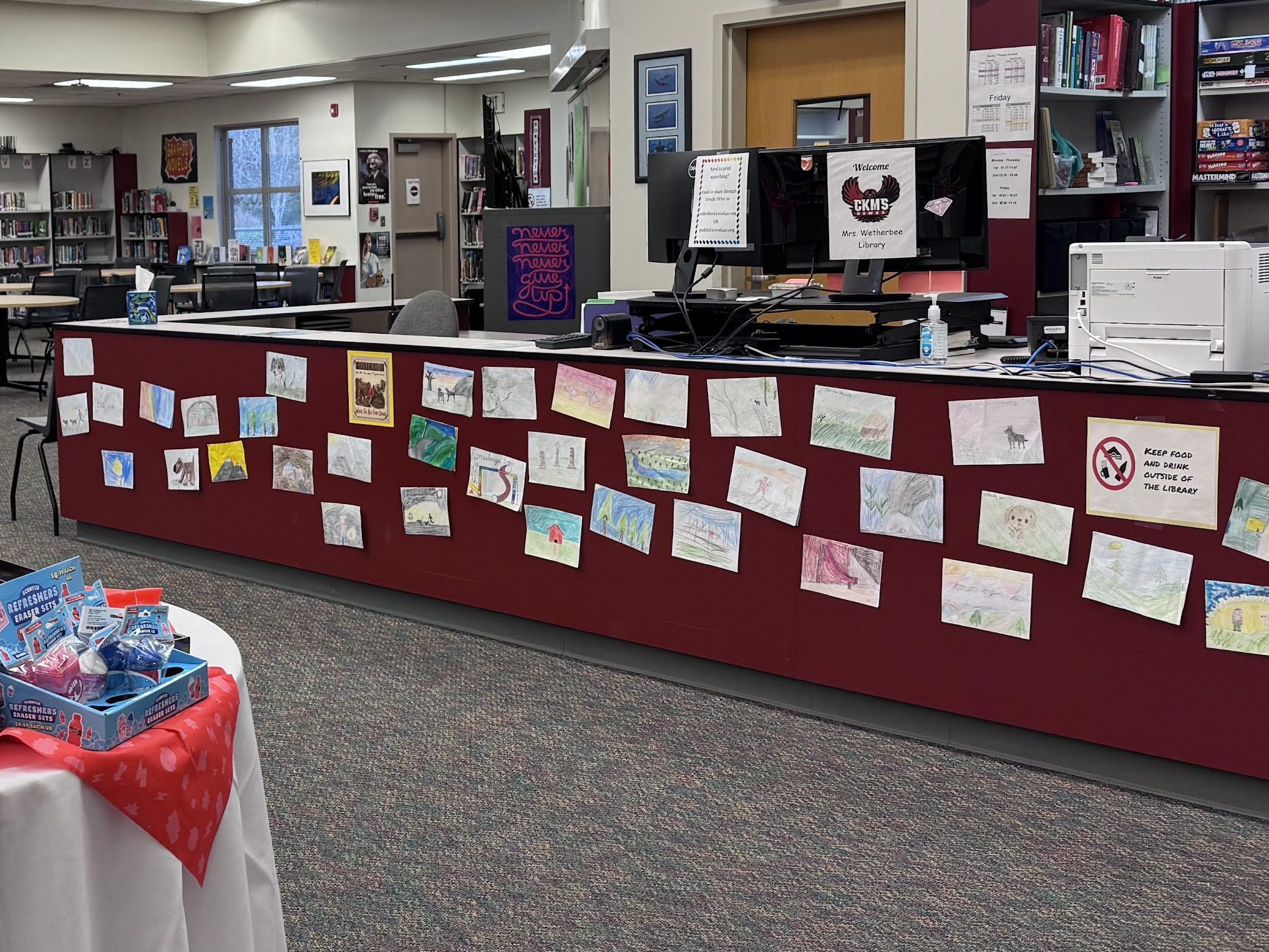 Prior to fair week, I emailed the ELA teachers asking if they had any student work we could highlight during the fair, especially during our Family event. One ELA teacher kindly shared these beautiful student-made postcards from their Where the Red Fern Grows unit, which we displayed during the fair.